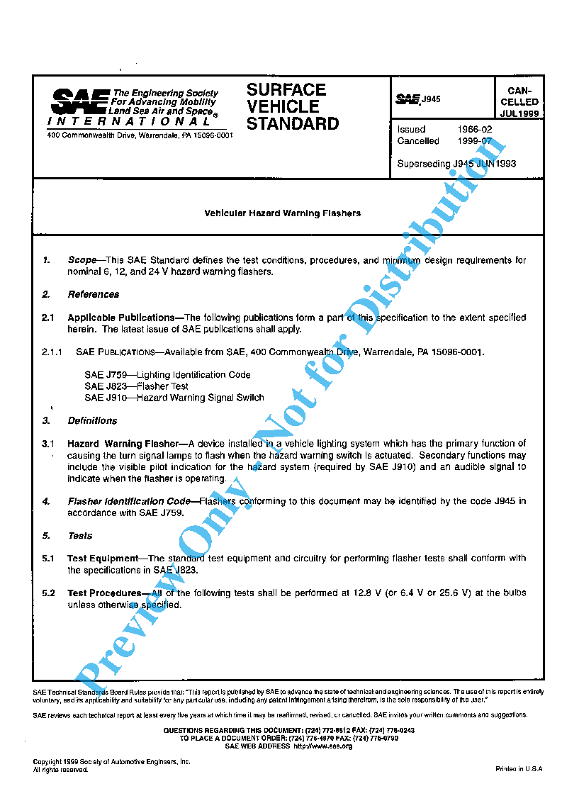 This SAE Standard defines the test conditions, procedures, and minimum design requirements for nominal 6, 12, and 24 V hazard warning flashers. Document cancelled 1999. Information now contained in J1690