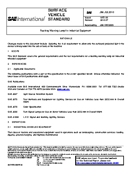 This SAE Standard covers the general requirements and the test requirements for a flashing warning lamp for industrial wheeled equipment.