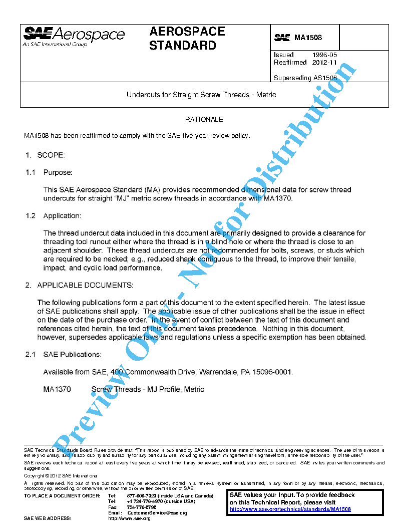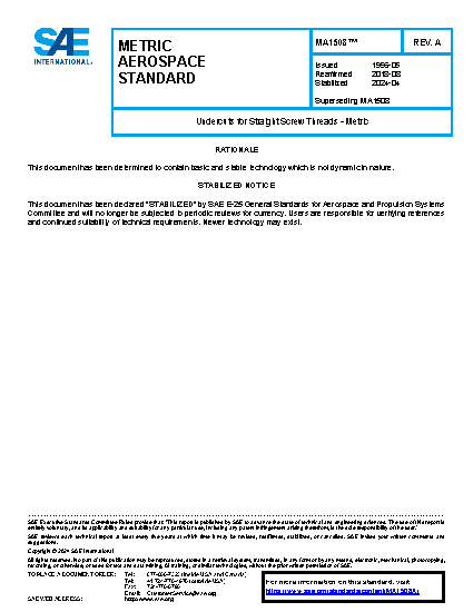 This SAE Aerospace Standard (MA) provides recommended dimensional data for screw thread undercuts for straight “MJ” metric screw threads in accordance with MA1370.