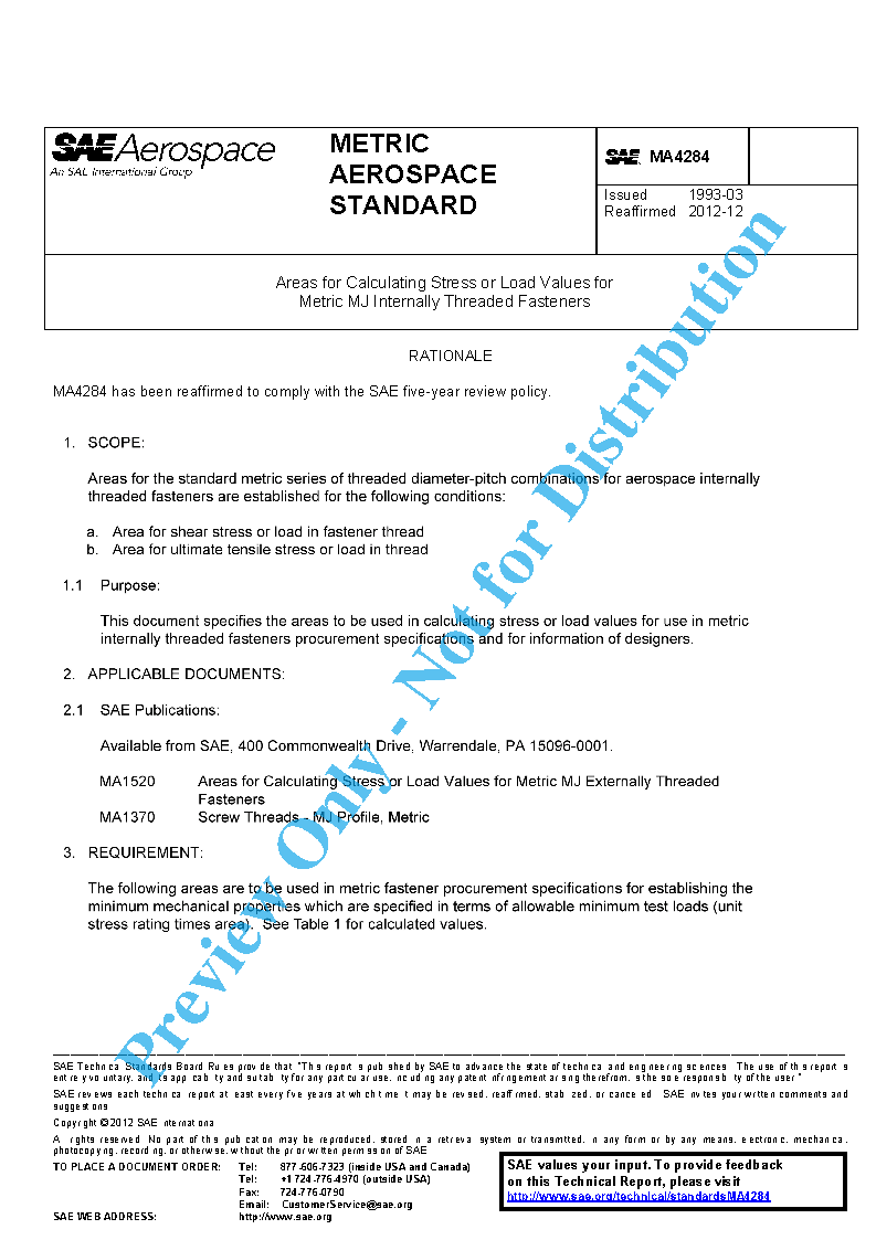 Areas for the standard metric series of threaded diameter-pitch combinations for aerospace internally threaded fasteners are established for the following conditions: