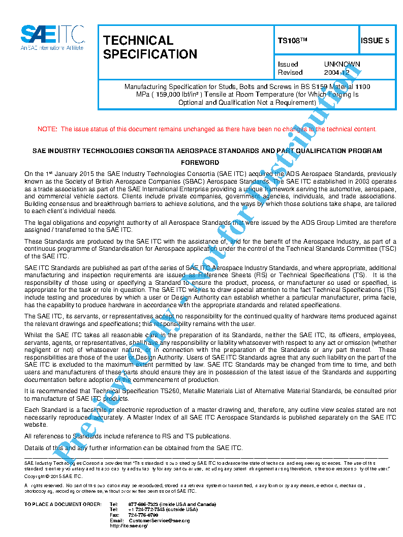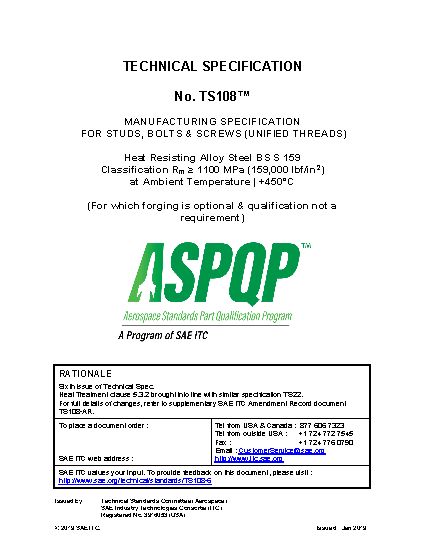 TS108 Manufacturing Specification for Studs, Bolts and Screws in BS S159 Material 1100 MPa (159,000 lbf/in² ) Tensile at Room Temperature (for which Forging Is Optional and Qualification not a Requirement)