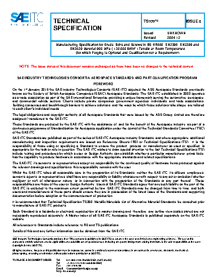 TS109 Manufacturing Specification for Studs, Bolts and Screws in BS HR650, EN2398, EN2399 and EN3639 Material 900 MPa (130,000 lbf/in² ) Tensile at Room Temperature (for which Forging is Optional and Qualification not a Requirement)