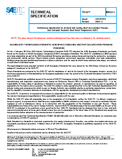 TS129 Performance Specification for All Metal Self-Locking Shaft Nuts (Unified Threads) Non-Corrosion Resistant Steel Rated Temperature 350°C