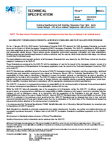 This technical specification document describes tests that certain parts may be required to meet. For example, this tech spec applies to Self Retaining Impedance Bolts All Diameters All Heads/Shanks/Lengths. To view suppliers qualified against this standard, visit https://ts200.sae-itc.org/.