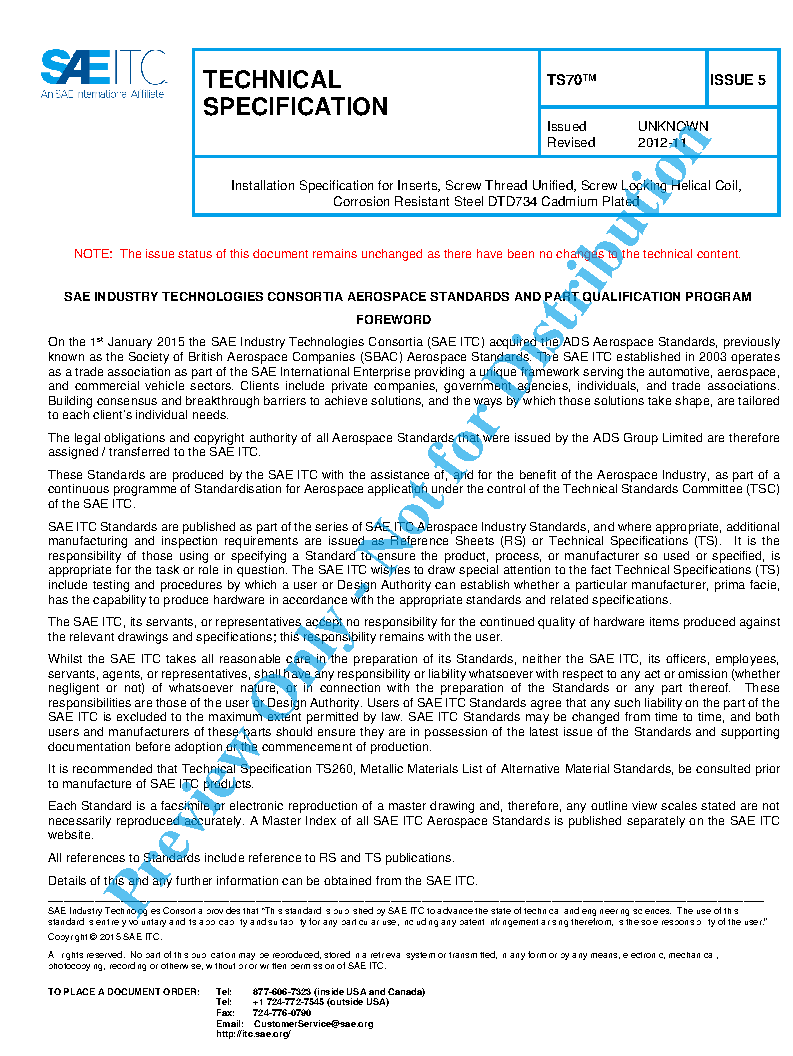 TS70 Installation Specification for Inserts, Screw Thread Unified, Screw Locking Helical Coil, Corrosion Resistant Steel DTD734 Cadmium Plated