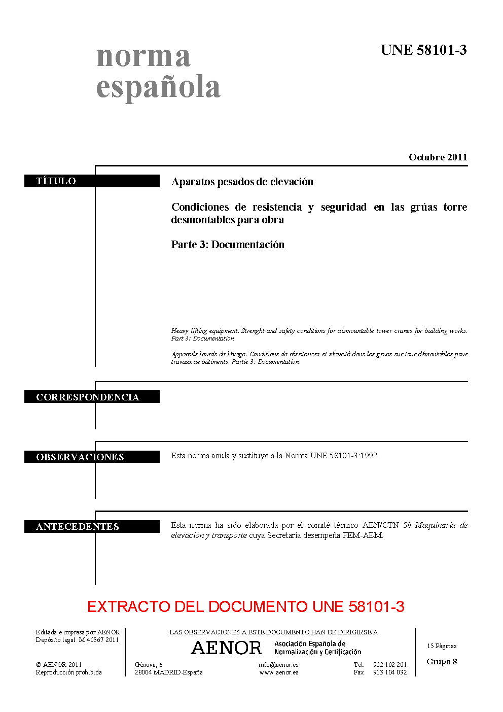 HEAVY LIFTING EQUIPMENT. STRENGHT AND SAFETY CONDITIONS FOR DISMOUNTABLE TOWER CRANES FOR BUILDING WORKS. PART 3: DOCUMENTATION.
