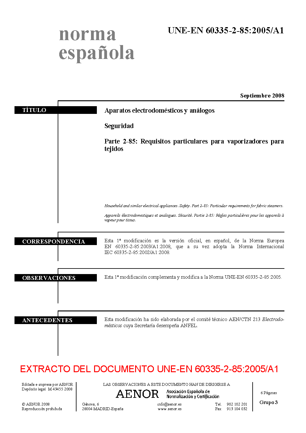 UNE-EN 60335-2-85:2005/A1:2008