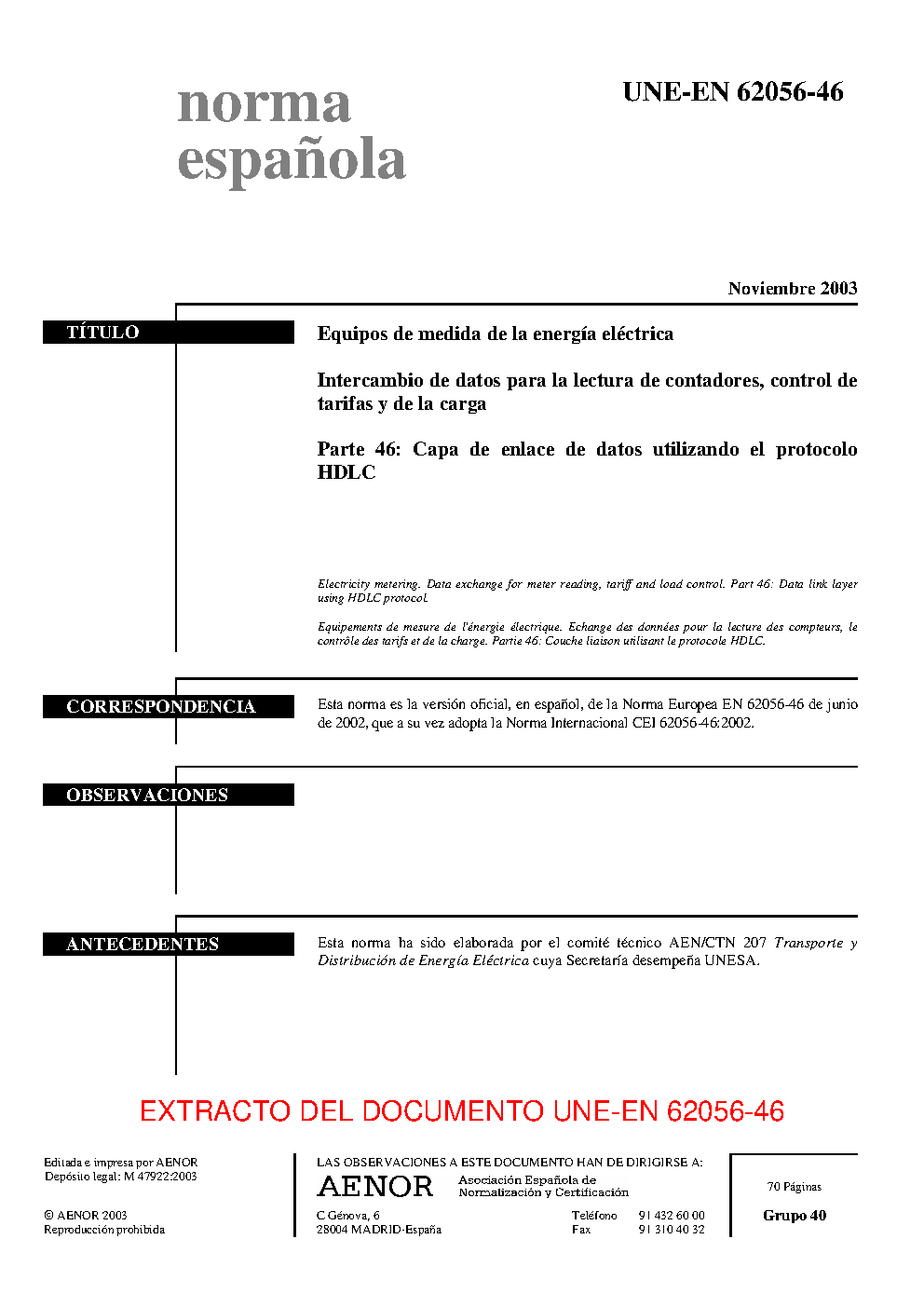 UNE-EN 62056-46:2003