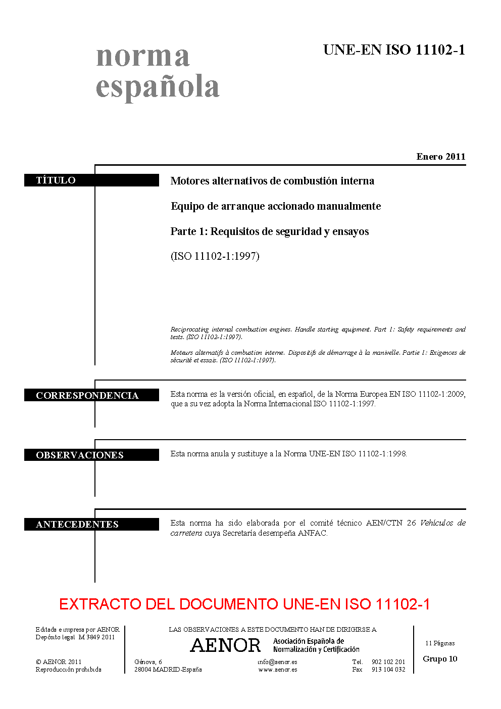 RECIPROCATING INTERNAL COMBUSTION ENGINES. HANDLE STARTING EQUIPMENT. PART 1: SAFETY REQUIREMETS AND TESTS. (ISO 11102-1:1997).