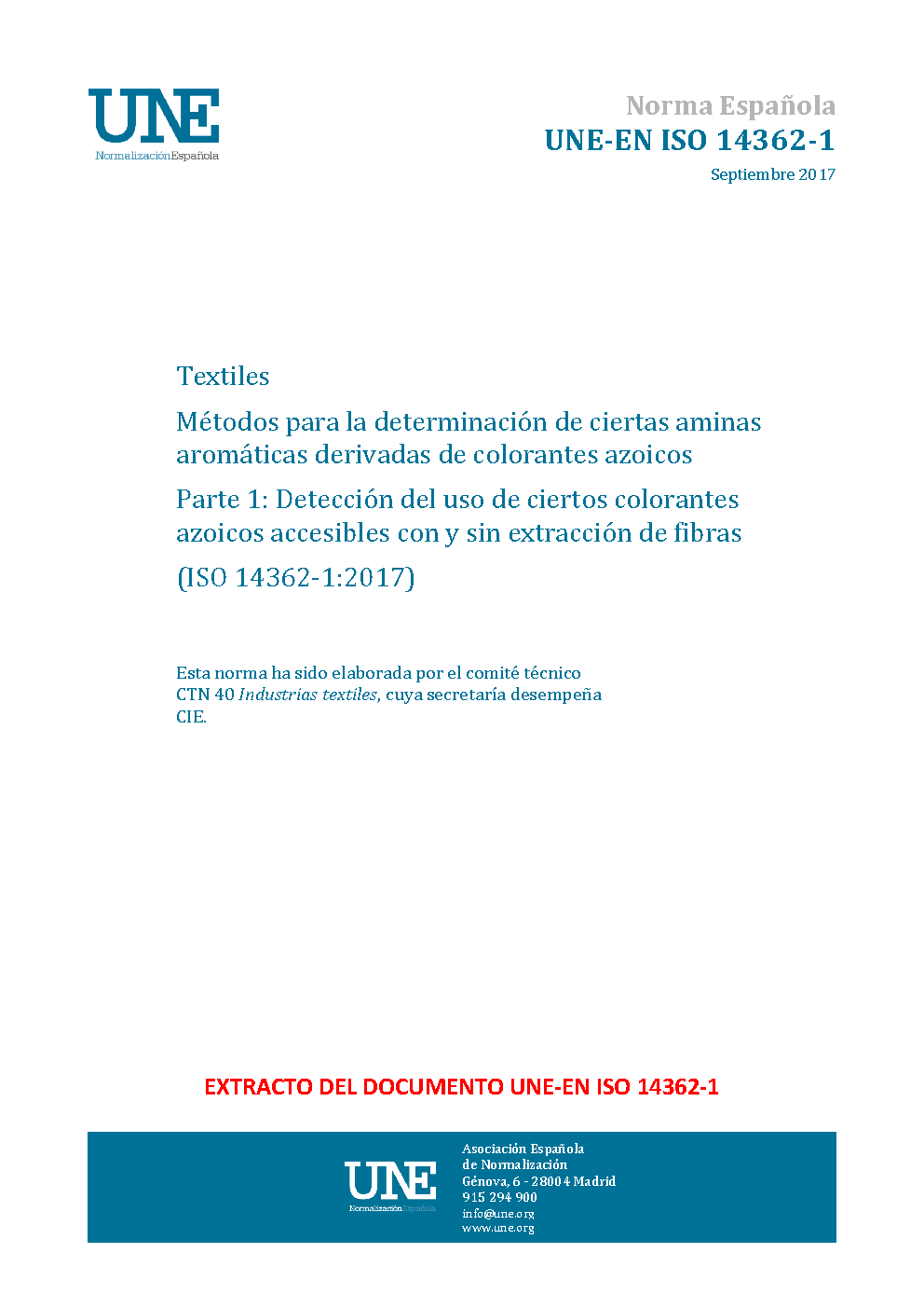 Textiles - Methods for determination of certain aromatic amines derived from azo colorants - Part 1: Detection of the use of certain azo colorants accessible with and without extracting the fibres (ISO 14362-1:2017)