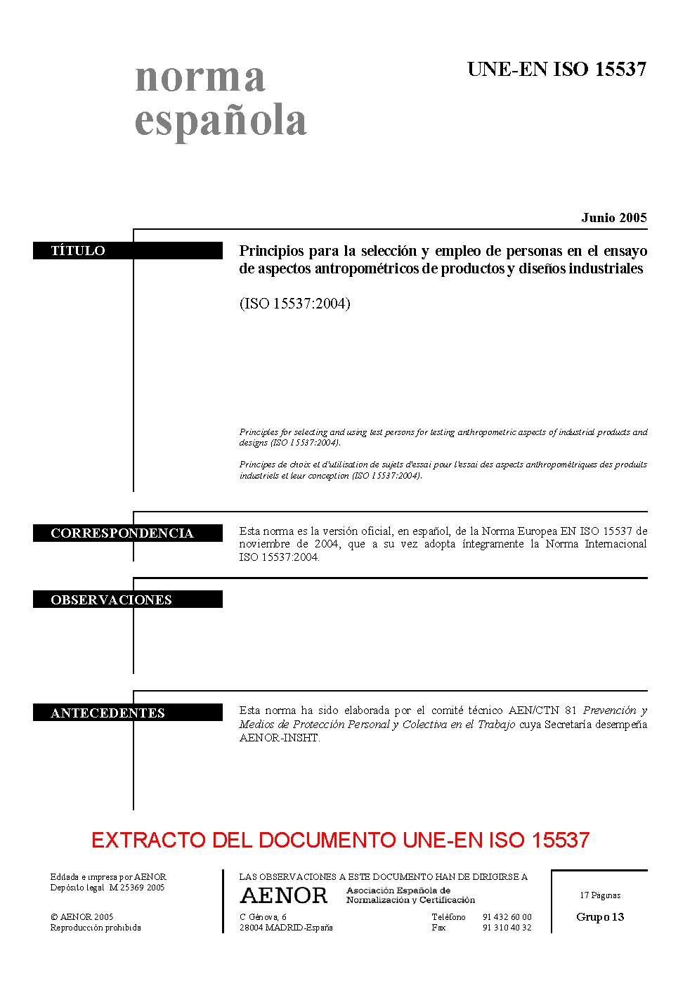 Principles for selecting and using test persons for testing anthropometric aspects of industrial products and designs (ISO 15537:2004)