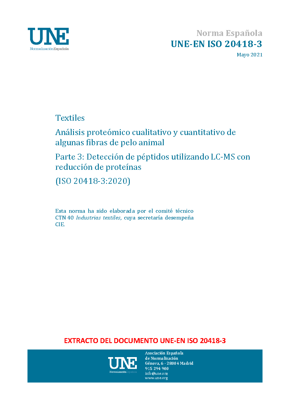 Textiles - Qualitative and quantitative proteomic analysis of some animal hair fibres - Part 3: Peptide detection using LC-MS without protein reduction (ISO 20418-3:2020)