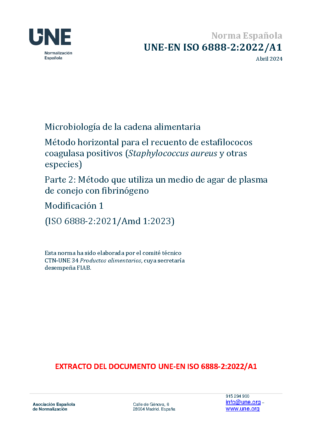 Microbiology of the food chain - Horizontal method for the enumeration of coagulase-positive staphylococci (Staphylococcus aureus and other species) - Part 2: Method using rabbit plasma fibrinogen agar medium - Amendment 1 (ISO 6888-2:2021/Amd 1:2023)